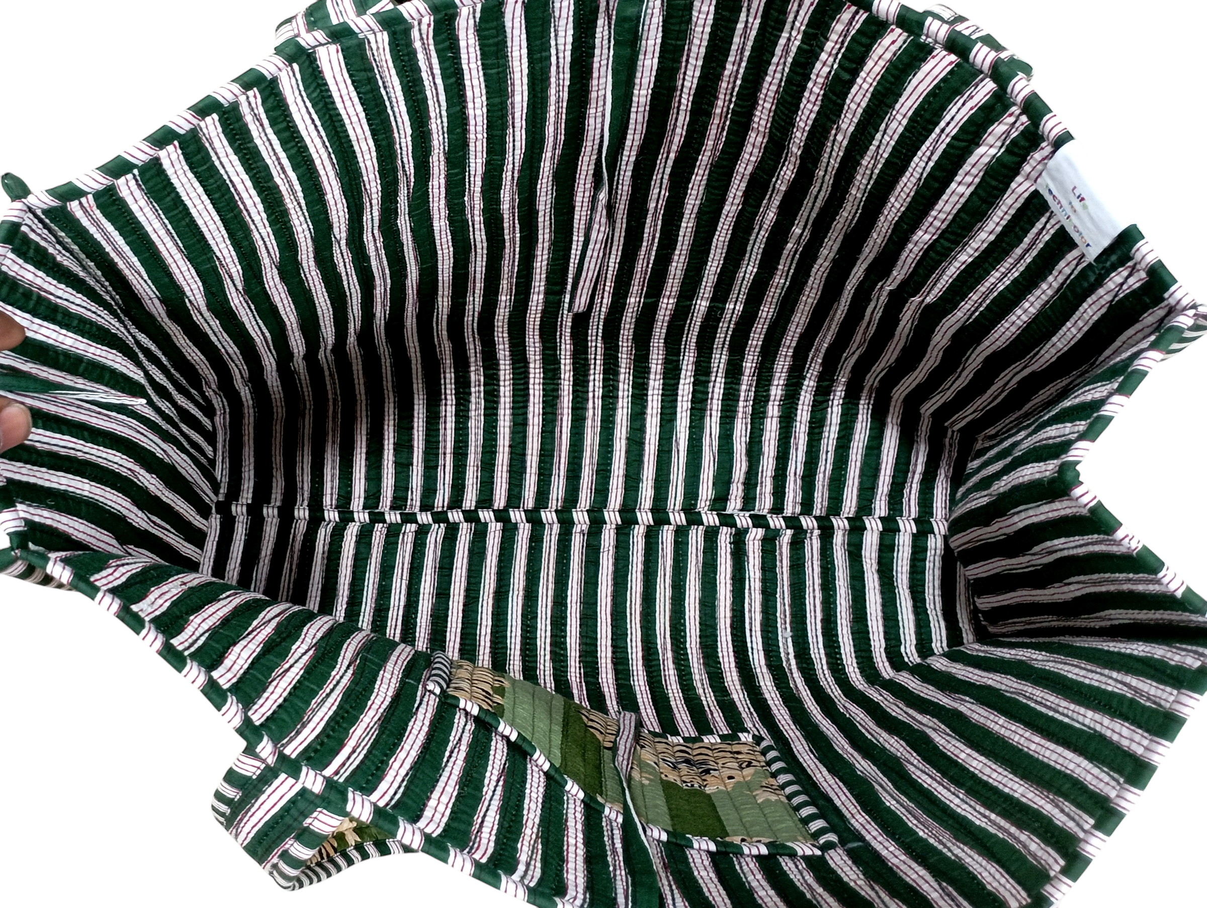 インドのプリント柄が特徴の中綿トートバッグです。軽量で容量が大きく、肩掛けもできるため、移動に便利です。リバーシブル仕様で、使うほどに愛着が湧くデザインです。内ポケットもあり、日常使いに便利です。