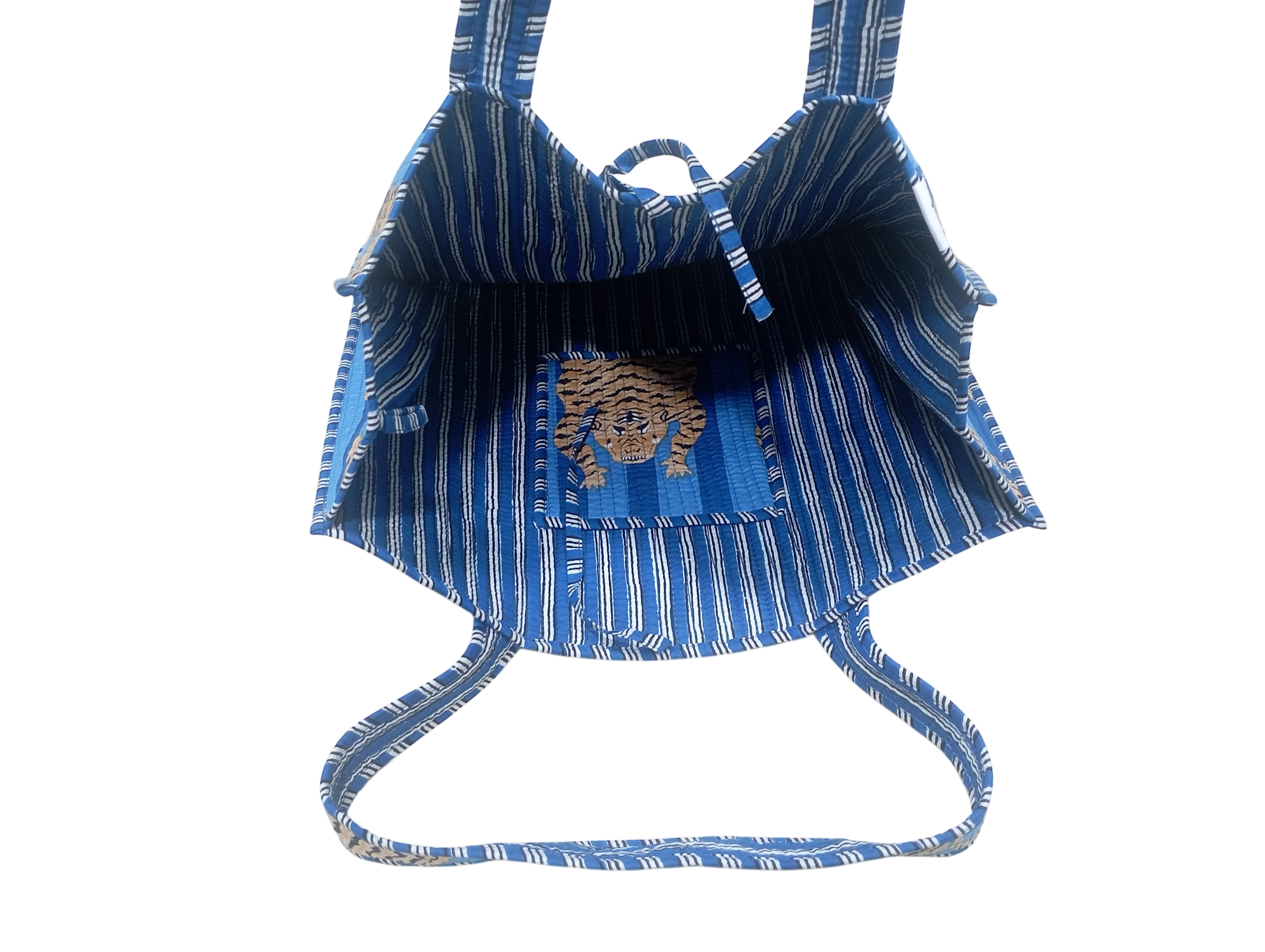 インドのプリント柄が特徴の中綿トートバッグです。軽量で容量が大きく、肩掛けもできるため、移動に便利です。リバーシブル仕様で、使うほどに愛着が湧くデザインです。内ポケットもあり、日常使いに便利です。