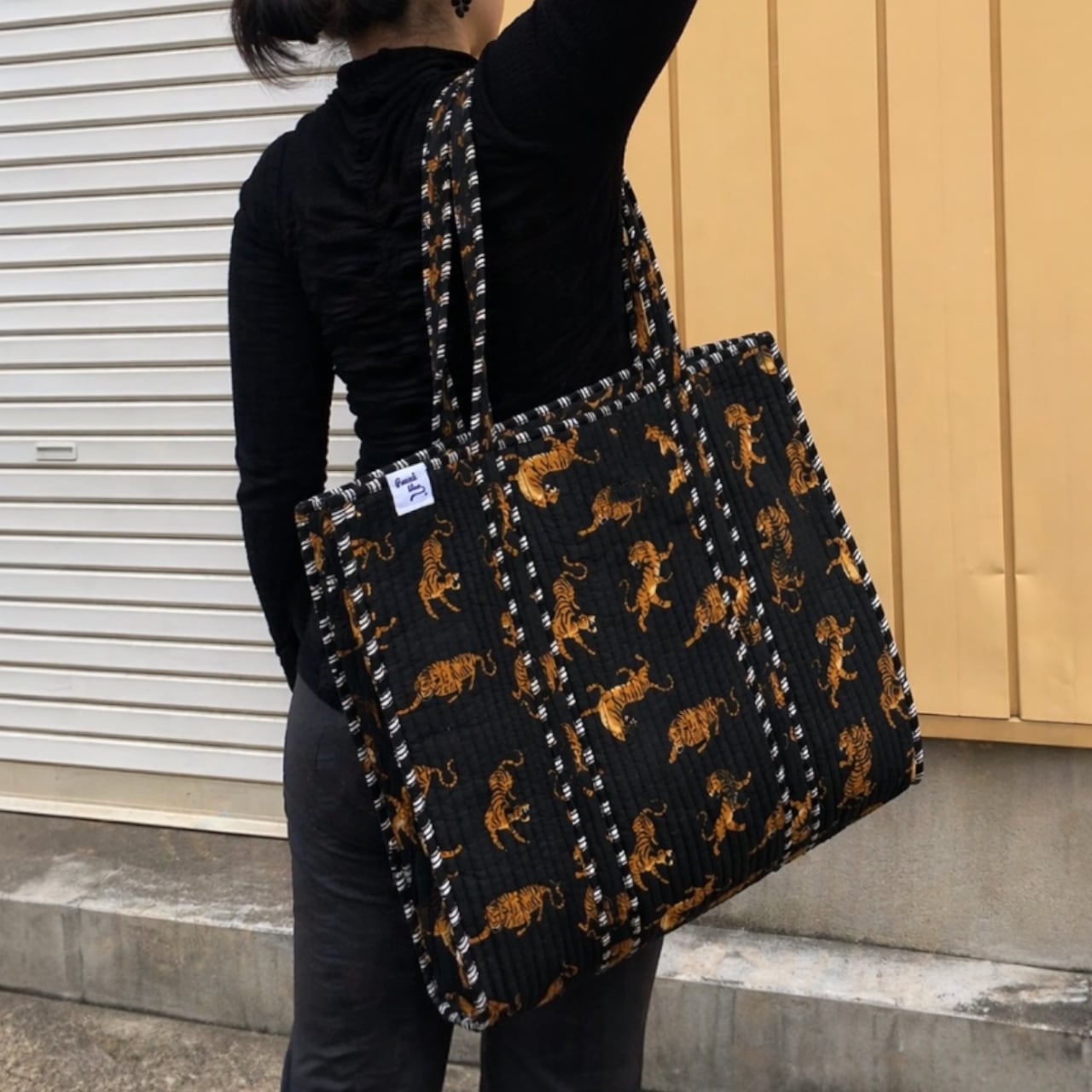 インドのプリント柄が特徴の中綿トートバッグです。軽量で容量が大きく、肩掛けもできるため、移動に便利です。リバーシブル仕様で、使うほどに愛着が湧くデザインです。内ポケットもあり、日常使いに便利です。