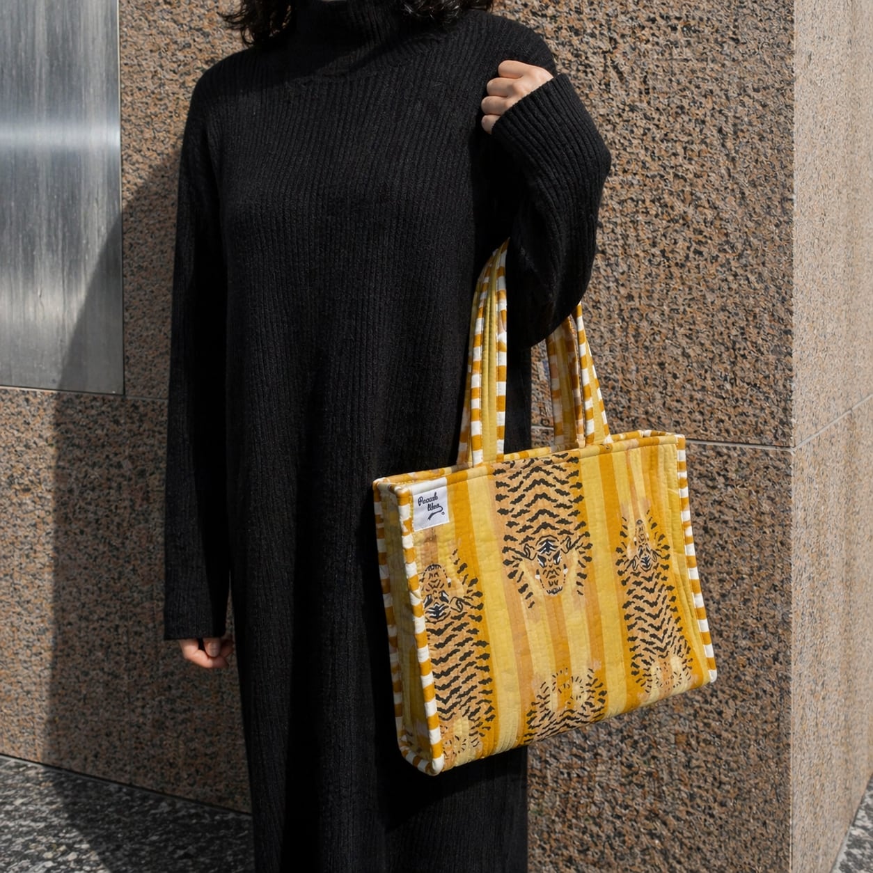 インドのプリント柄が特徴の中綿トートバッグです。軽量で容量が大きく、肩掛けもできるため、移動に便利です。リバーシブル仕様で、使うほどに愛着が湧くデザインです。内ポケットもあり、日常使いに便利です。