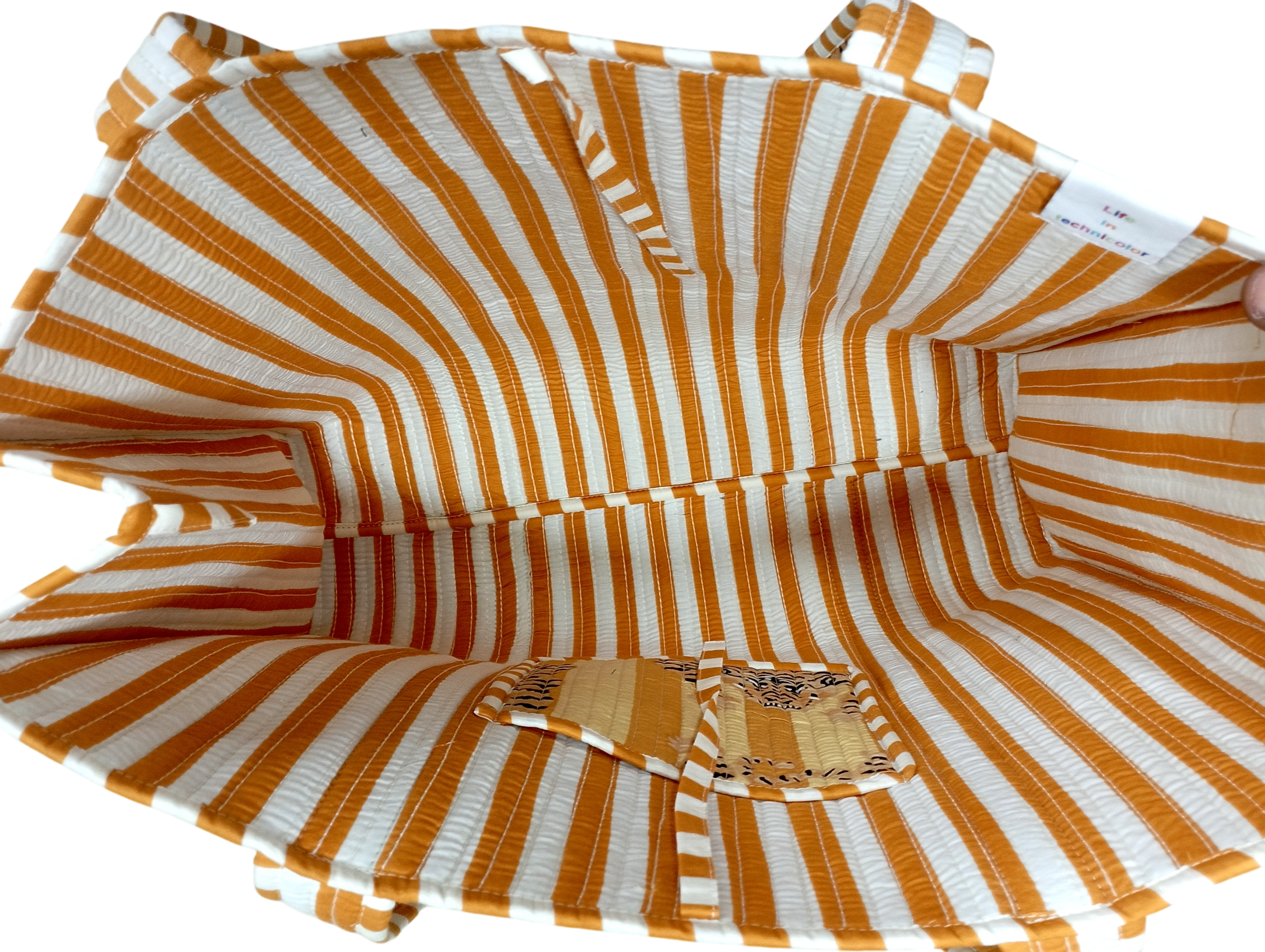 インドのプリント柄が特徴の中綿トートバッグです。お弁当やちょっとした荷物を入れるのにちょうどいいコンパクトサイズで、気軽なお出かけやサブバッグとしてもおすすめです。リバーシブル仕様で、使うほどに愛着が湧くデザインです。内ポケットもあり、日常使いに便利です。このバッグで、日常に個性と便利さをプラスしてみませんか?