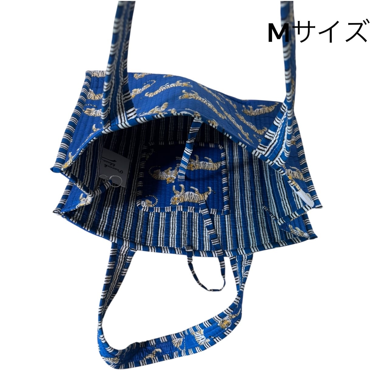 インドのプリント柄が特徴の中綿トートバッグです。軽量で容量が大きく、肩掛けもできるため、移動に便利です。リバーシブル仕様で、使うほどに愛着が湧くデザインです。内ポケットもあり、日常使いに便利です。