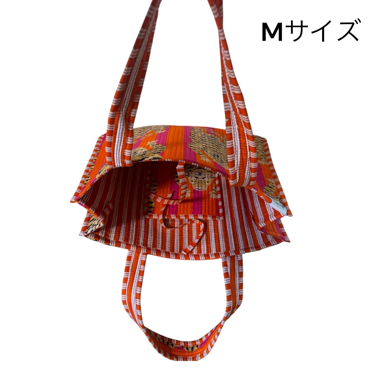 インドのプリント柄が特徴の中綿トートバッグです。軽量で容量が大きく、肩掛けもできるため、移動に便利です。リバーシブル仕様で、使うほどに愛着が湧くデザインです。内ポケットもあり、日常使いに便利です。