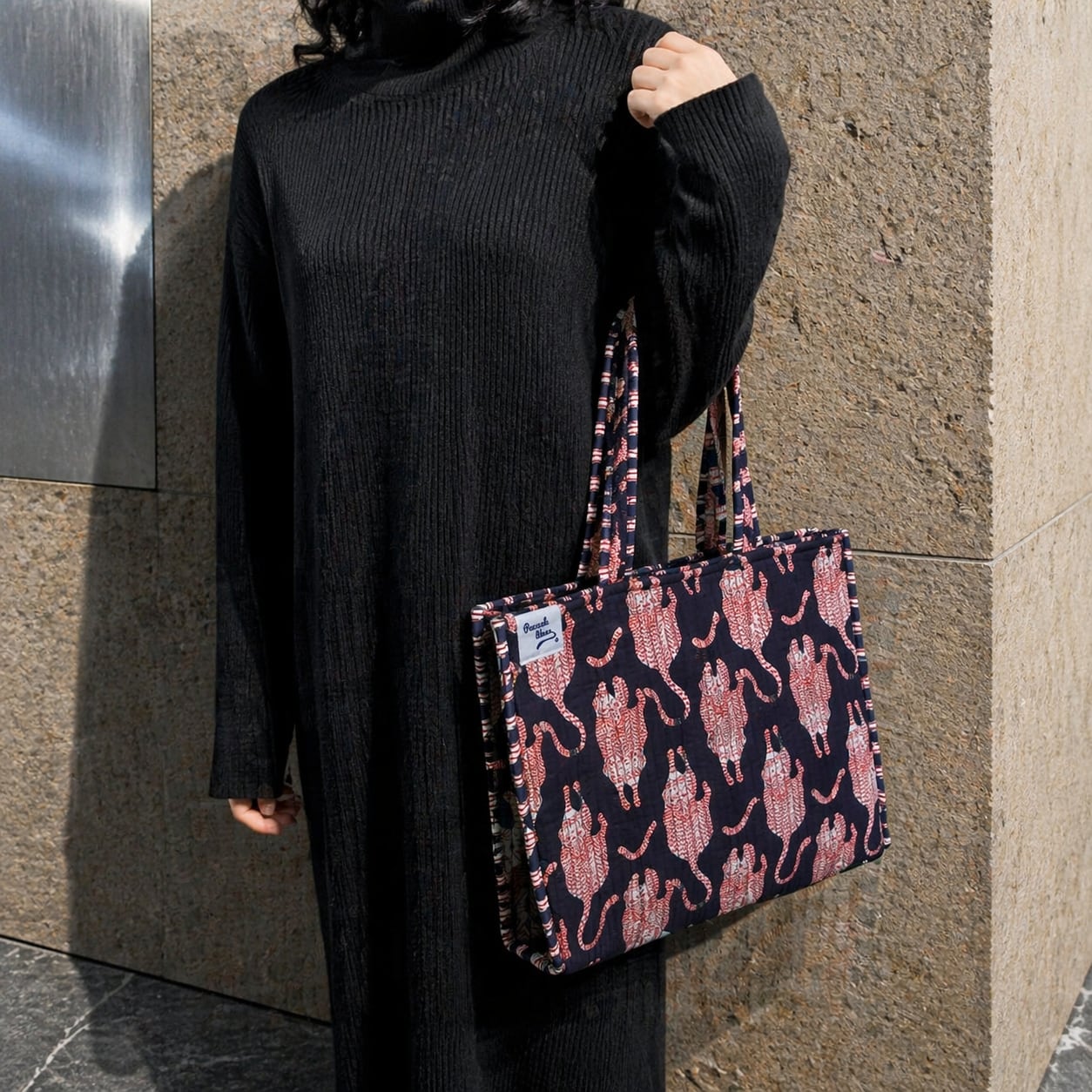 インドのプリント柄が特徴の中綿トートバッグです。軽量で容量が大きく、肩掛けもできるため、移動に便利です。リバーシブル仕様で、使うほどに愛着が湧くデザインです。内ポケットもあり、日常使いに便利です。
